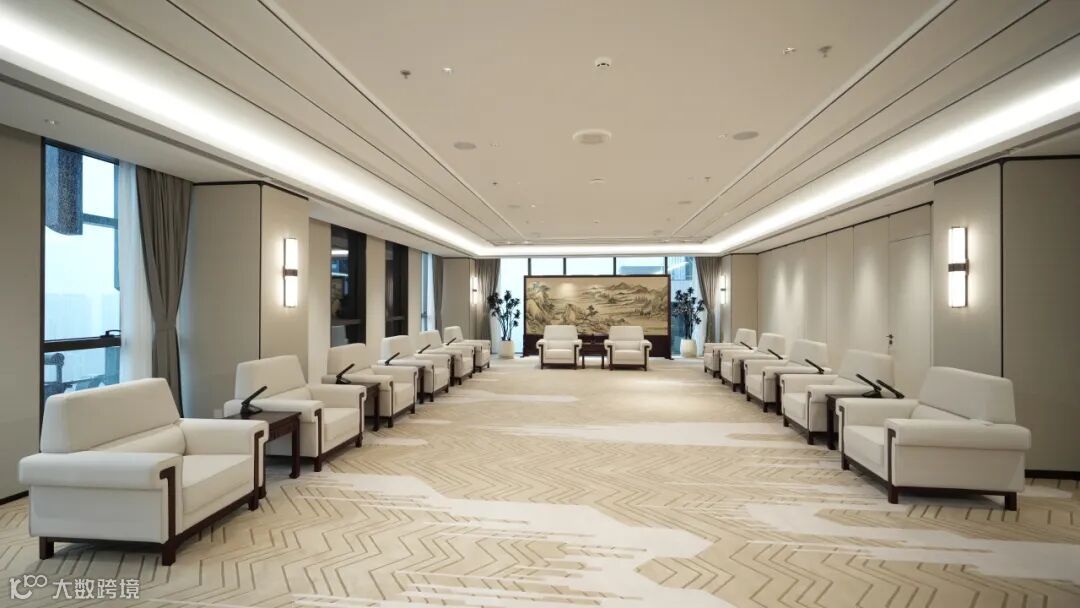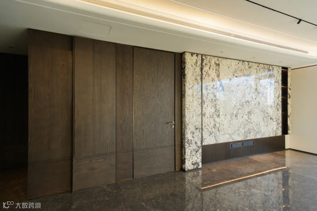 项目18层的城市会客厅,设有八扇高4.8米、宽1.8米的超大型旋转门,门扇选用桃花芯实木与意大利液态金属板精制。安装过程中,团队引入8组红外激光发射器,最终使旋转门闭合缝隙误差控制在2mm以内、形变控制在0.3mm内,以高精度工艺成就空间的点睛之笔。