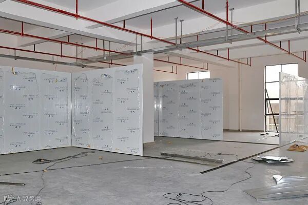 第三,整个隔断的结构做好,就可以进行封墙面板。若是单层彩钢板常规是采用900型或840型来封墙面,若用的夹芯板就采用950型或1125型夹芯平板来封墙面。