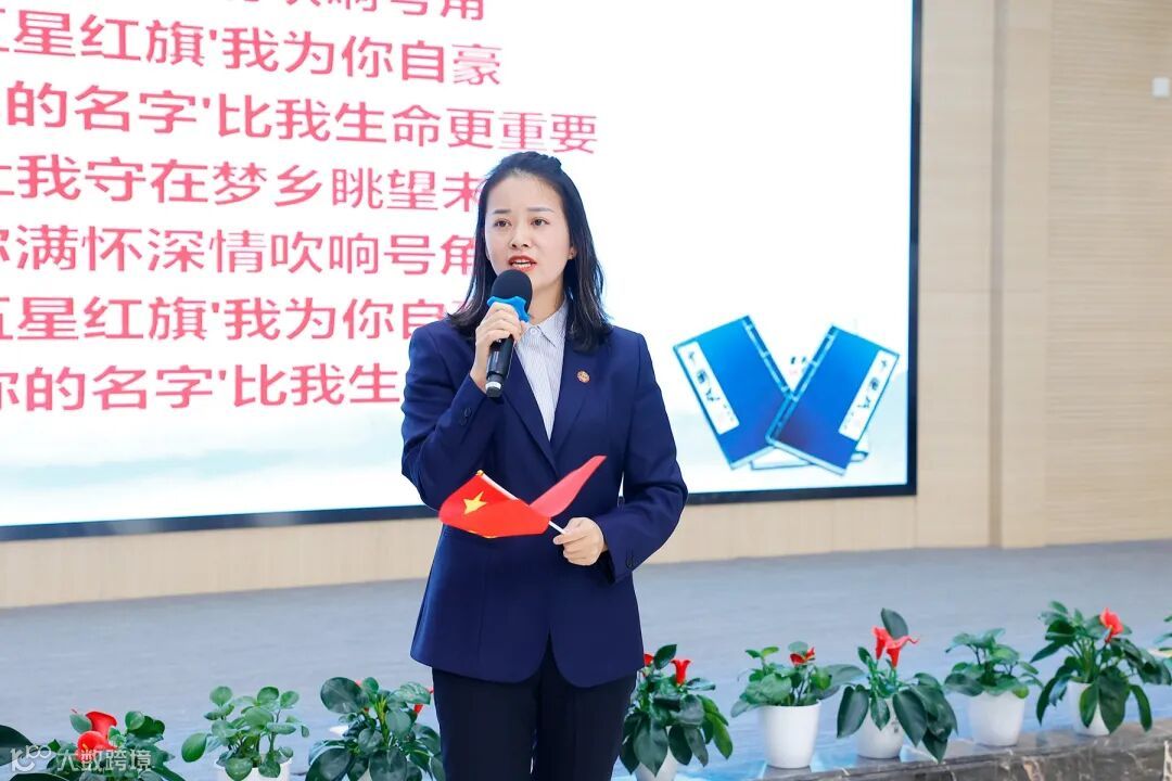 任菲和职工们共同唱响了歌曲《红旗飘飘》,当唱到“五星红旗,你是我的骄傲,五星红旗,我为你自豪”时,嘹亮的歌声响彻整间会议室。任菲还为职工们献唱了红色歌曲《母亲是中华》。