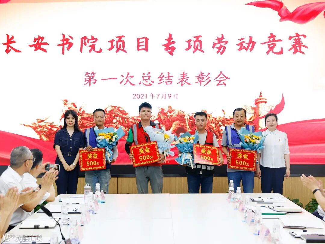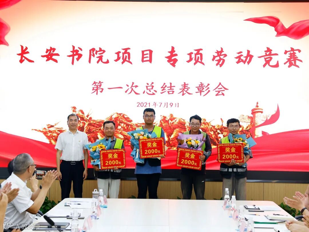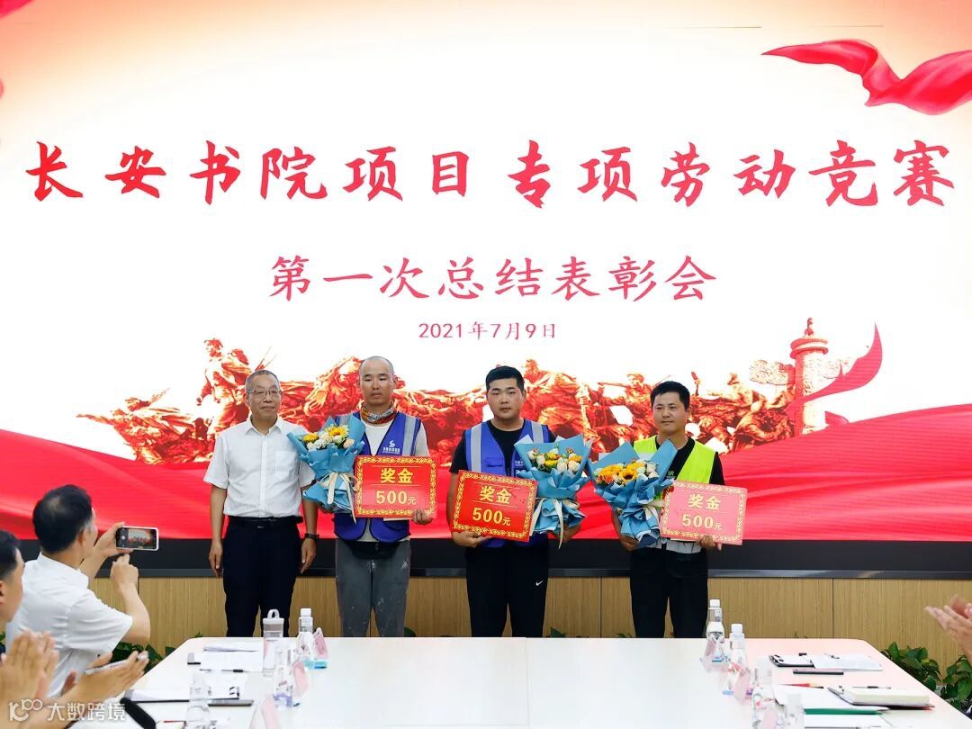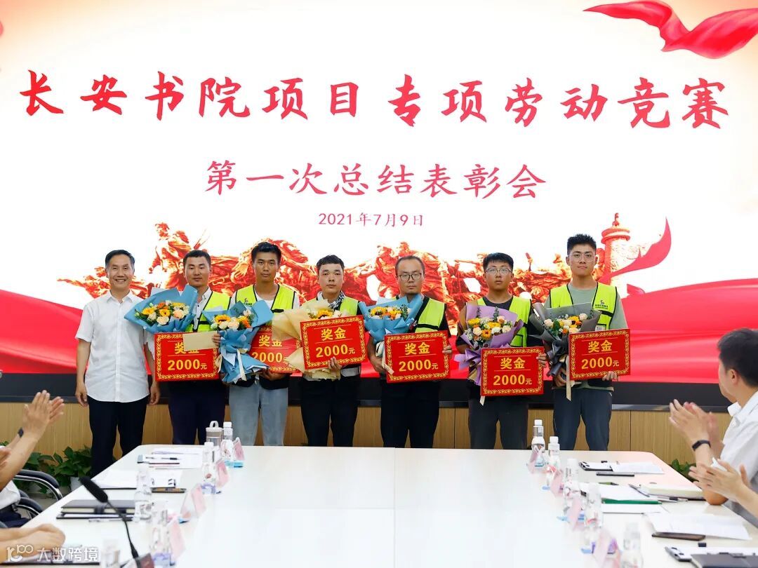 长安书院项目经理杨占涛对第一阶段项目完成情况进行了汇报,获奖的各工区代表、先进个人分别作交流发言。发言结束后,集团各部门负责人分别就长安书院项目第一阶段劳动竞赛开展情况进行了点评。