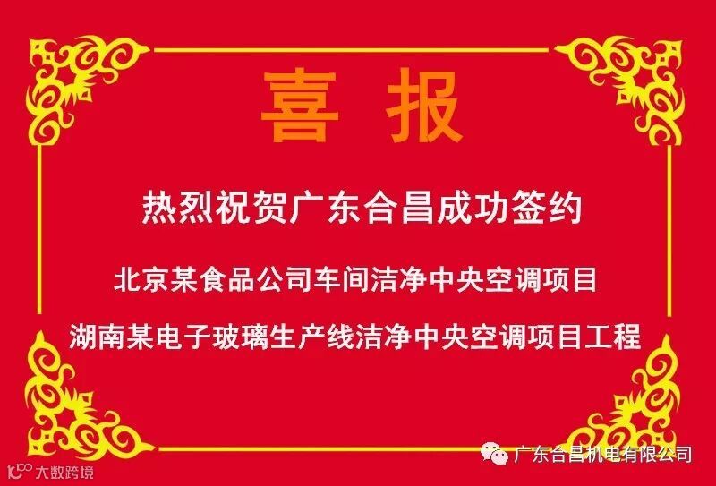 5月14日广东合昌机电有限公司成功签约北京某食品公司车间洁净中央空调采购安装工程项目,现此项目的材料已基本准备好,计划本月底进驻。