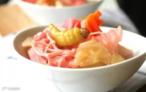 食材:热开水、泡椒水、姜、泡椒、金针菇、白萝卜、青笋、白醋、盐、花椒、圆白菜、红心美萝卜、胡萝卜