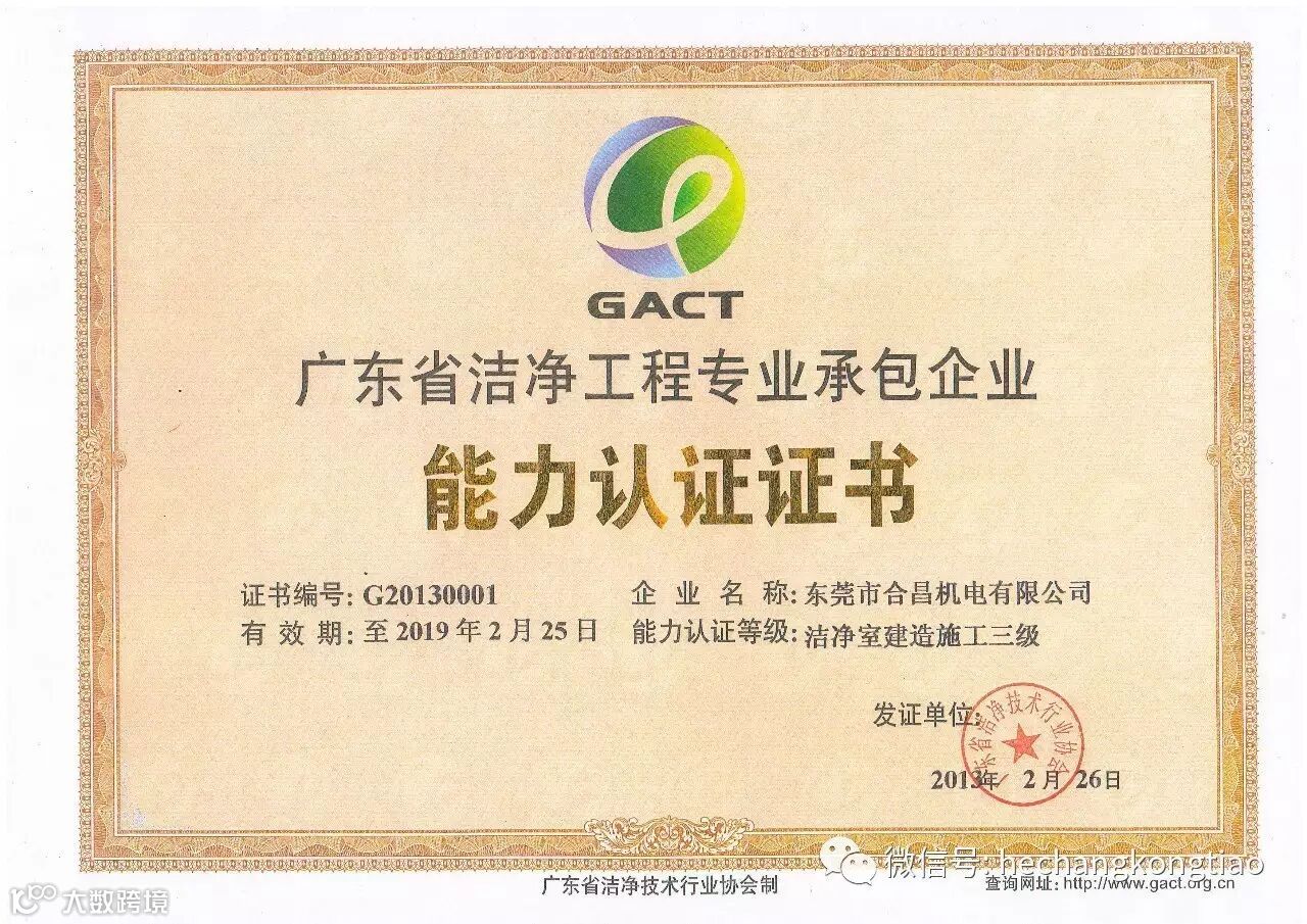 东莞市合昌机电有限公司在电子制造、生物制药、印刷包装、食品日化、光电光学、医疗卫生等行业中有17年设计与施工经验,拥有建筑机电安装工程专业承包叁级资质,和一支专业的工程师队伍,可专业设计、施工百级、千级、万级、十万级、三十万级的无尘净化空间。服务电话:0769-38960866