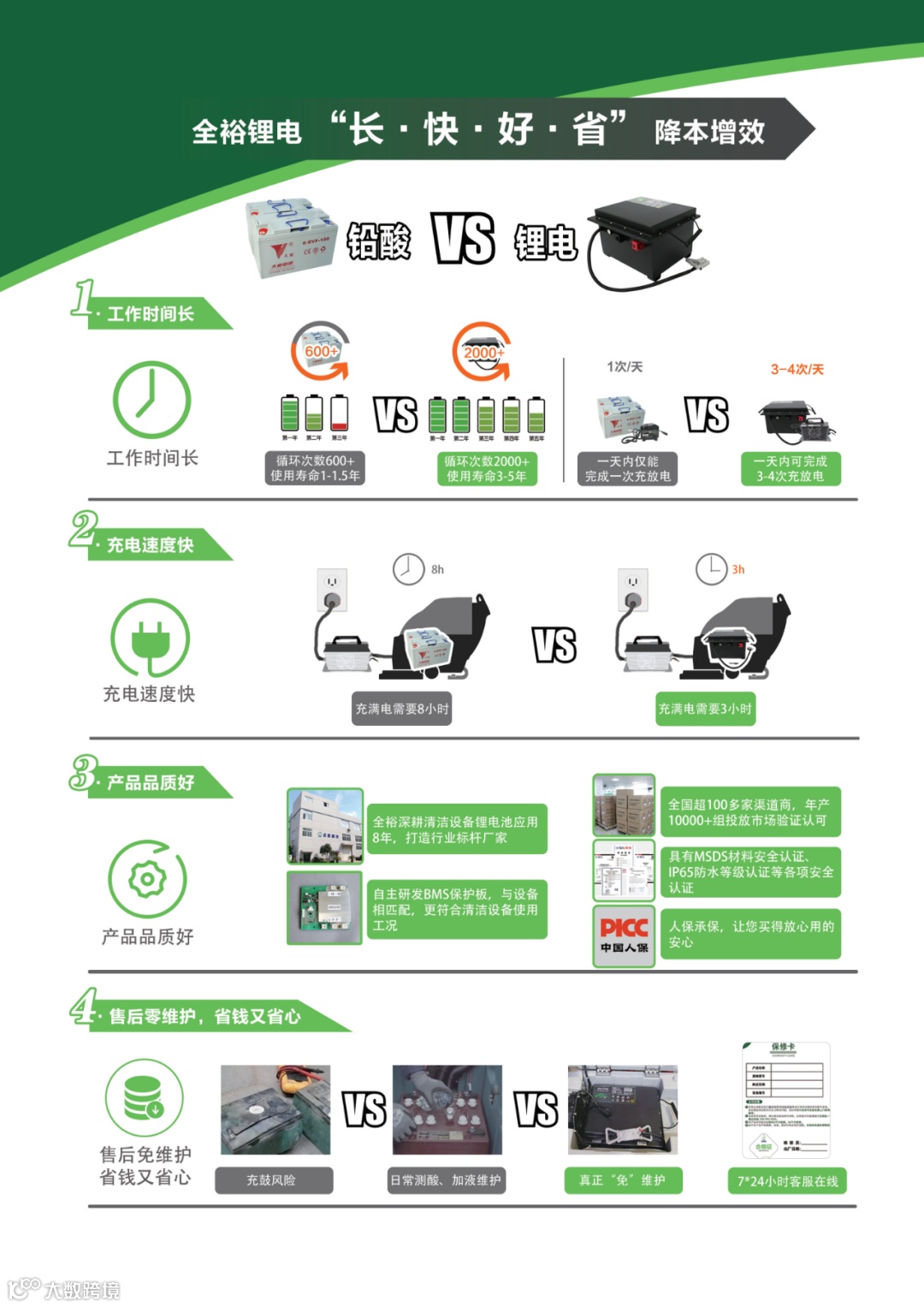 清洁设备方面现在也有了成熟的锂电池产品。但因为先入为主、价格和对锂电池的功效不确定等因素,很多客户一直还在使用铅酸电池。