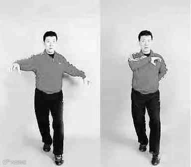 走路时,两手半握,虎口张开成弧形。左脚向前迈步的同时,双手向身体两侧打开,在左脚落地的同时,右手轻轻拍打左胸,左手则向右侧后腰处拍打。