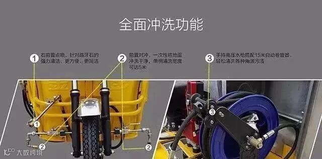 强劲的高压冲洗系统能够有效的清除路面、建筑物灰尘污渍,能高效的清洗环卫站、公交车、工程车辆等,可实现一机多用,是市政环卫、工商保洁、建筑工矿企业清洁的理想产品。