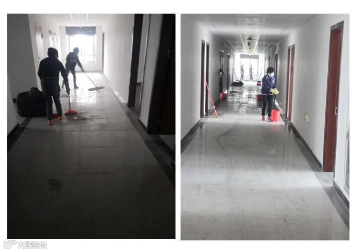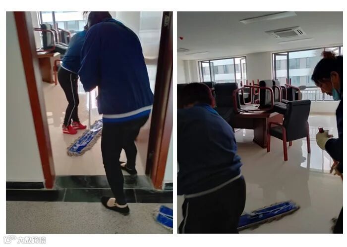 保洁期间,娘子军们合理分工,配合默契,从控制污染源出发,有序开展保洁工作。最后用84消毒液对场地进行全面消毒,留给客户安心、放心的工作环境。