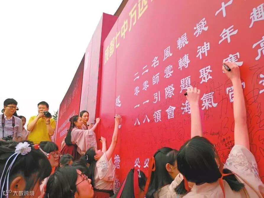 即将参加高考的学生在高考签名墙签名。图片来源:华西都市报