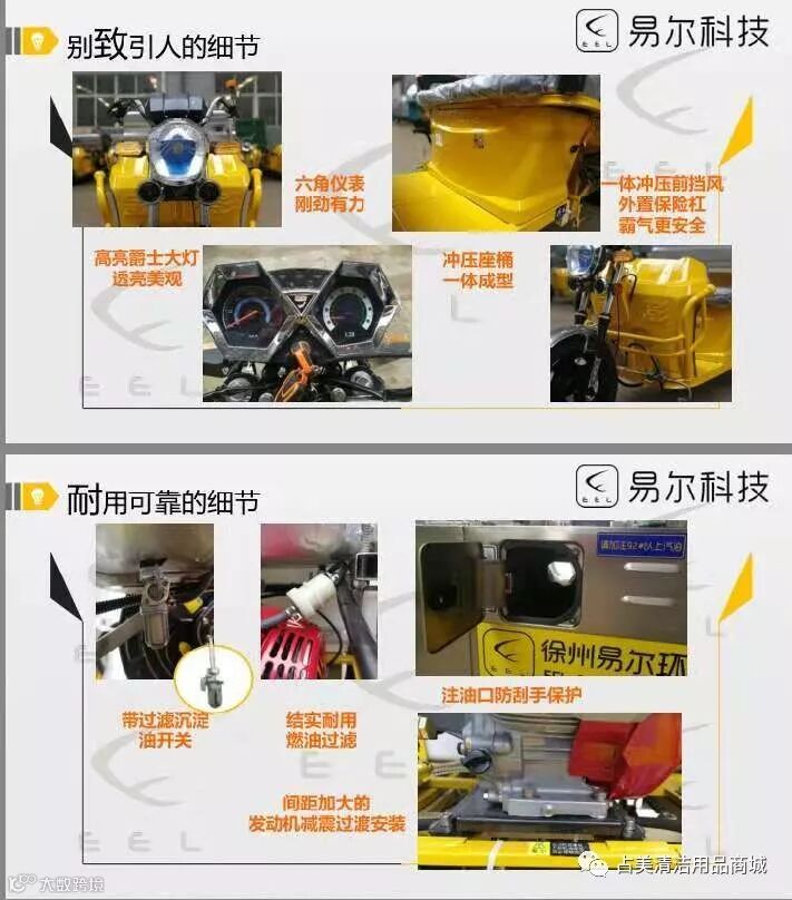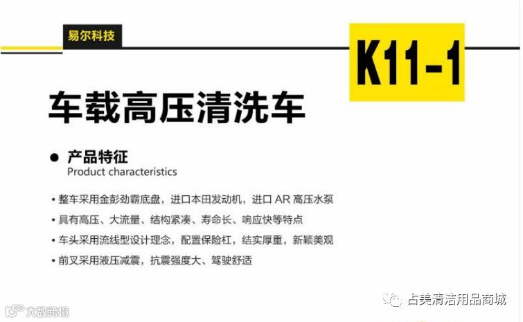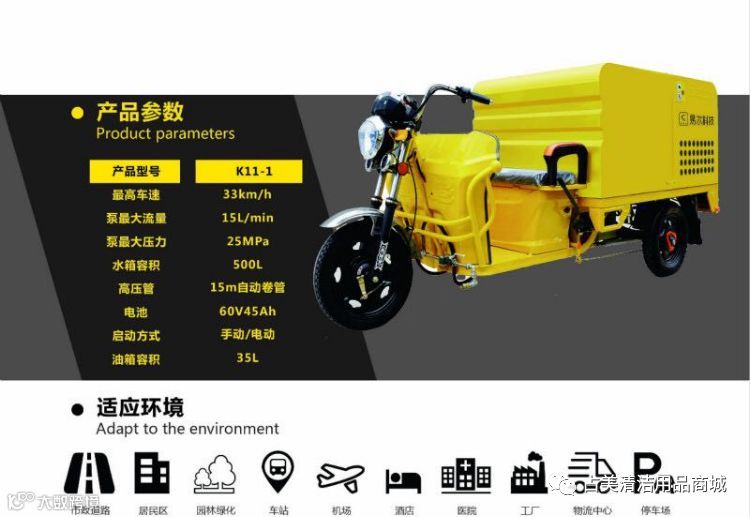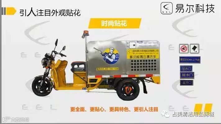 易尔科技车载高压清洗车产品特征整车采用金彭劲霸底盘,本田发动机,意大利AR高压水泵具有高压、大流量、结构紧凑、寿命长、响应快等特点车头采用流线型设计理念,配置保险杠,结实厚重,新颖美观前叉采用液压减震,抗震强度大、驾驶舒适产品参数 最高车速 33km/h泵最大流量 15L/min泵最大压力 25MPa水箱容积 500L 高压管 15m自动卷管 电池 60V45Ah启动方式 手动/电动油箱容积 35L 。