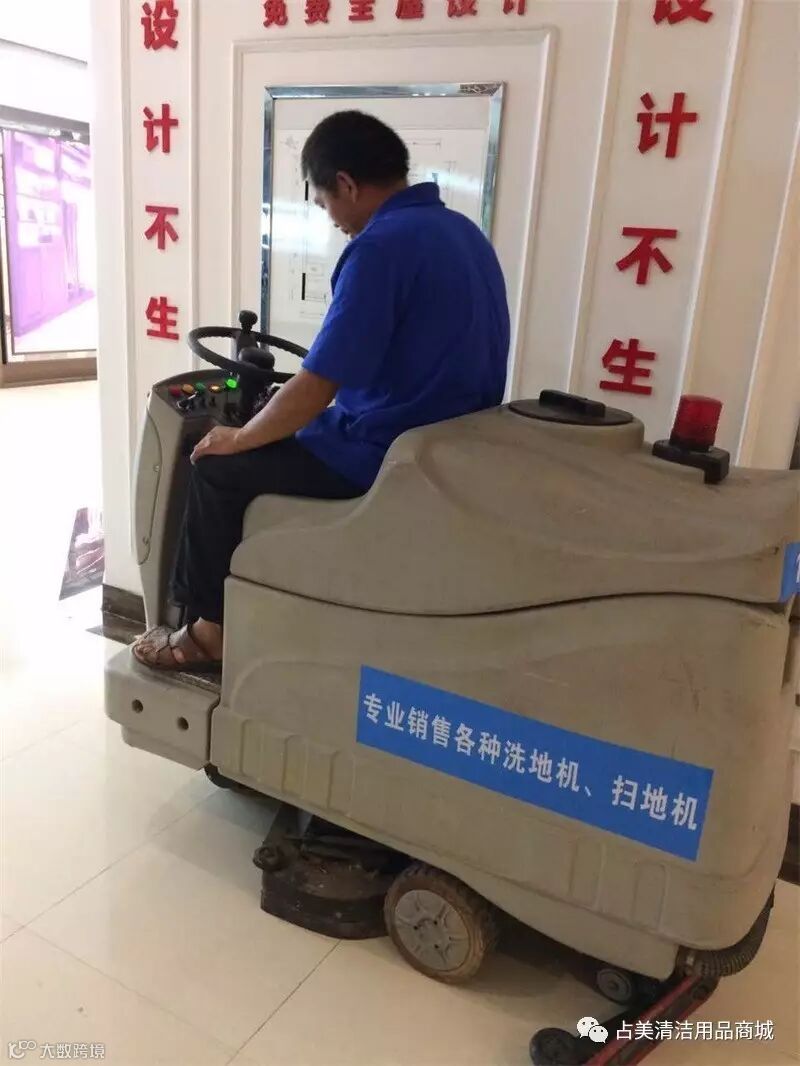 我们占美公司的保洁员亲自上阵试用“清洁战车”—驾驶式洗地车,感受它的清洗效果如何。