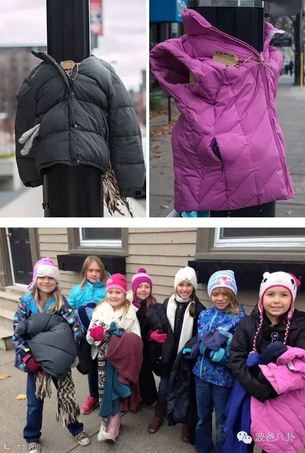 #12 这些加拿大的孩子,把厚衣服穿在路边柱子上,让无家可归的流浪者自己取用,以渡过这个冬天。