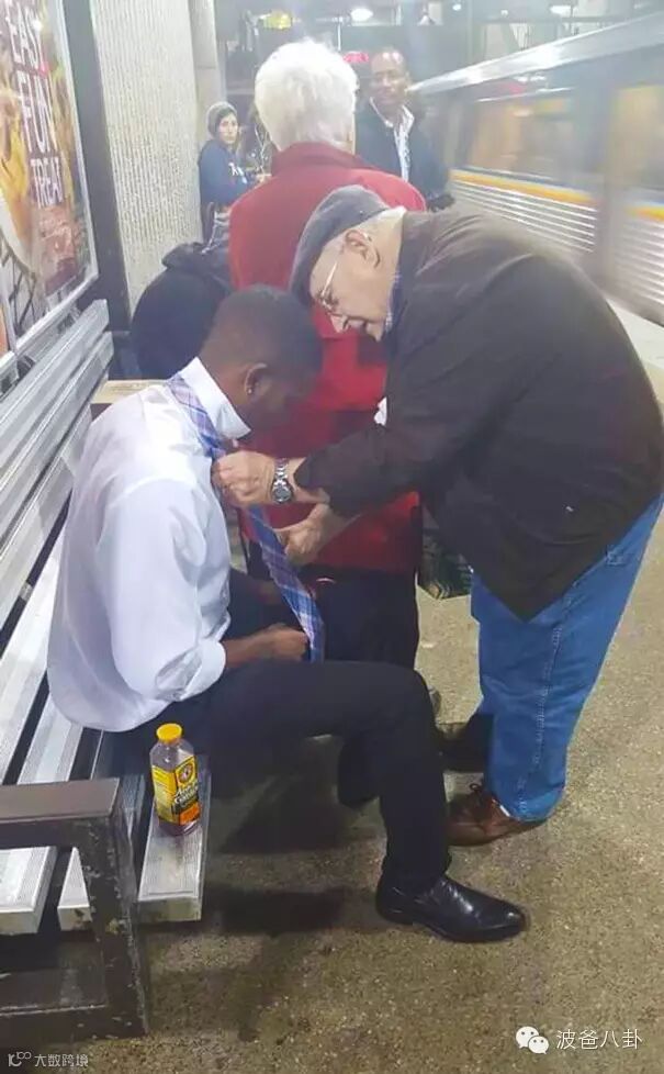 #9 地铁站上,一位也许是着急去面试的年轻人,怎么也弄不好他的领带。一位过路的老人毫不犹豫的上前,一步一步教他系领带。