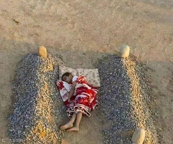 一张令人心酸的照片,叙利亚内战中这个孩子的父母双亡,留下一小孩,小孩每当想起父母就跑到父母坟上,睡在自己父母的坟墓旁边,充当父母活着那样陪伴父母并感受父母的存在。这是一种多么孤独无助的感觉啊!让人落泪,试想我们多少人的父母健在,却没有放在心上,漠视父母的存在…