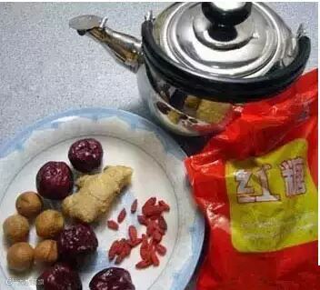 大红枣5粒左右、桂圆5粒、姜半块、枸杞1小撮、红糖适量