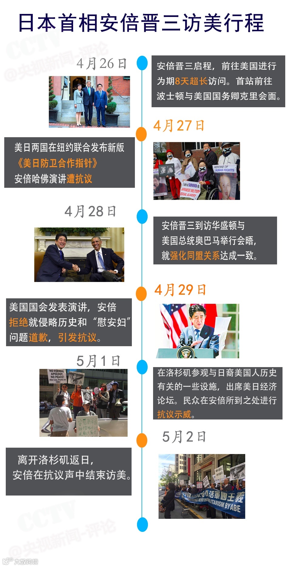 日本首相安倍晋三结束了他长达八天的美国之行。5月2日在洛杉矶——其美国行程的最后一站——数百名亚裔美国人集会抗议,要求安倍道歉并承认历史事实。