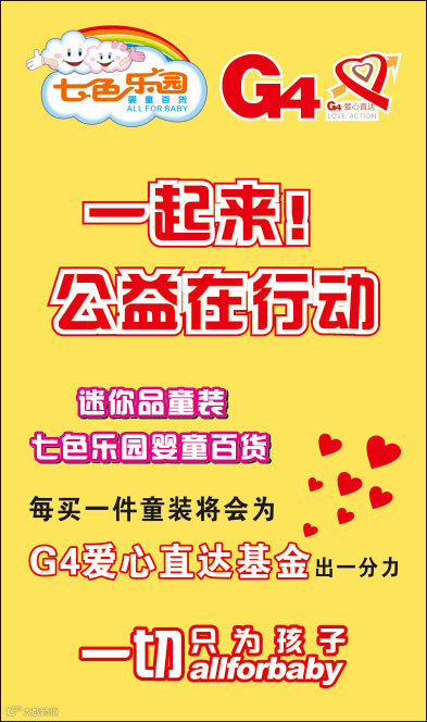 暑假到了,各位亲爱的宝宝,炎炎夏日到哪里玩呢?来跟着我们七色乐园参加我们的有意义的活动吧~~~!7月20日下午2点,我们七色乐园联合G4在广州中华广场举行爱心义卖哦~~!届时我们有迷你品童装展出,热心的粉丝们不妨有空到中华广场多逛逛,多多支持我们的义卖活动。小编我届时会等待你们的到来的哦~么么哒╭(╯3╰)╮
