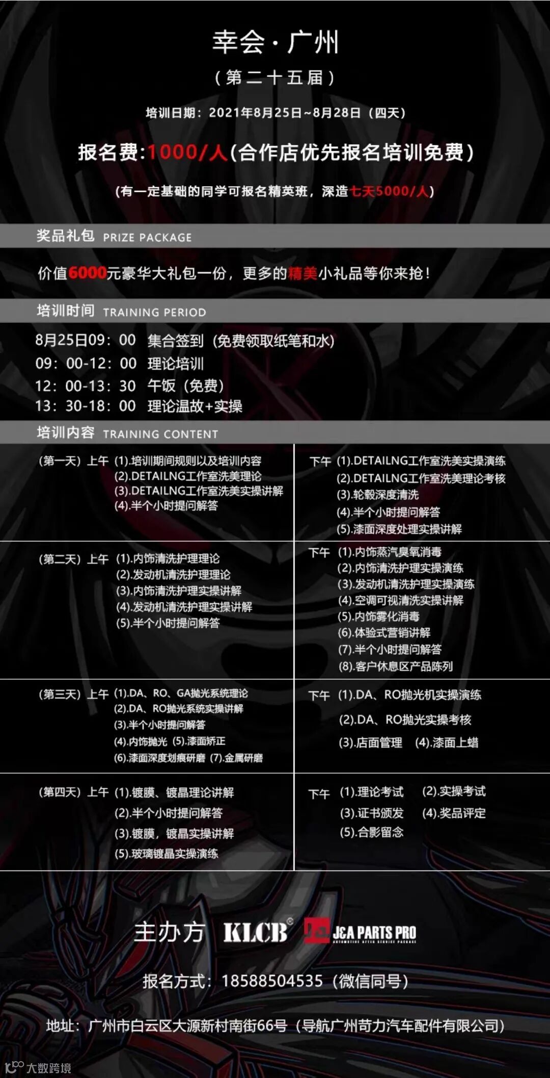 NO.2 第二十五届高端洗美培训会(8月25日~8月28日),进入报名阶段,合作店进行优先免费报名!不断学习才能不断成长,苛力培训班,主要以高端美容,精洗,抛光,镀晶镀膜为主,免费提供午餐,还未报名的抓紧时间哦!