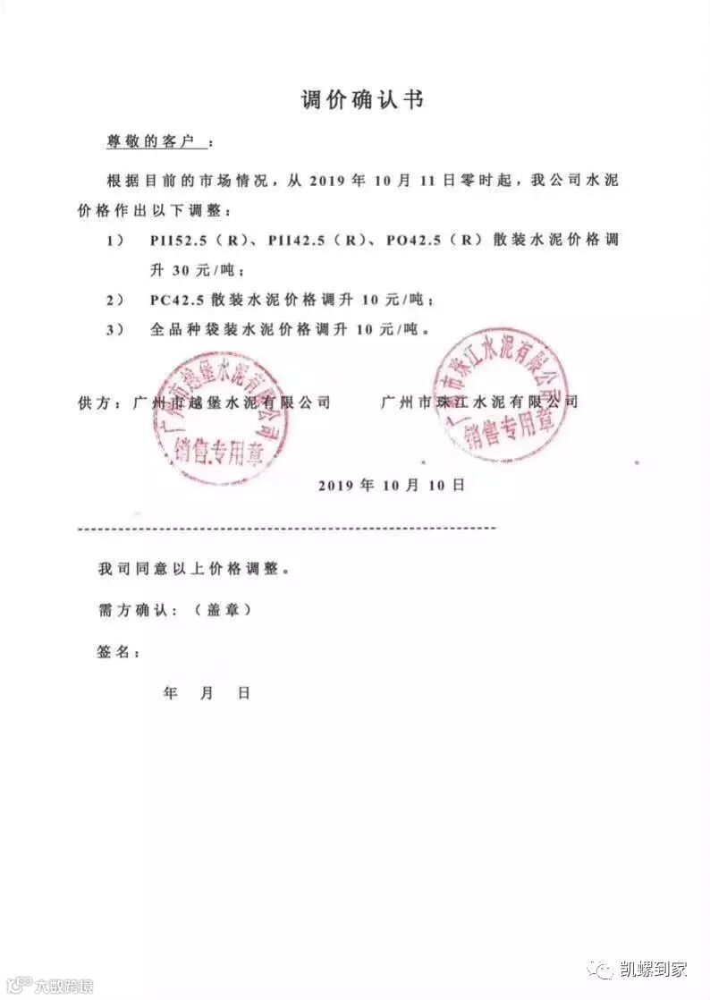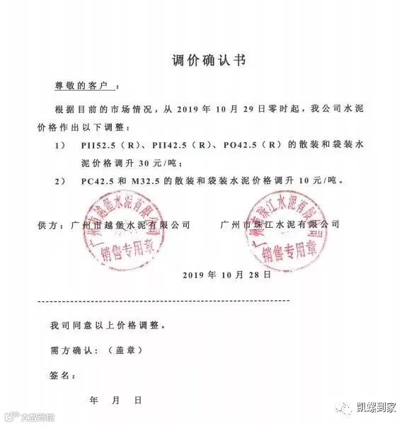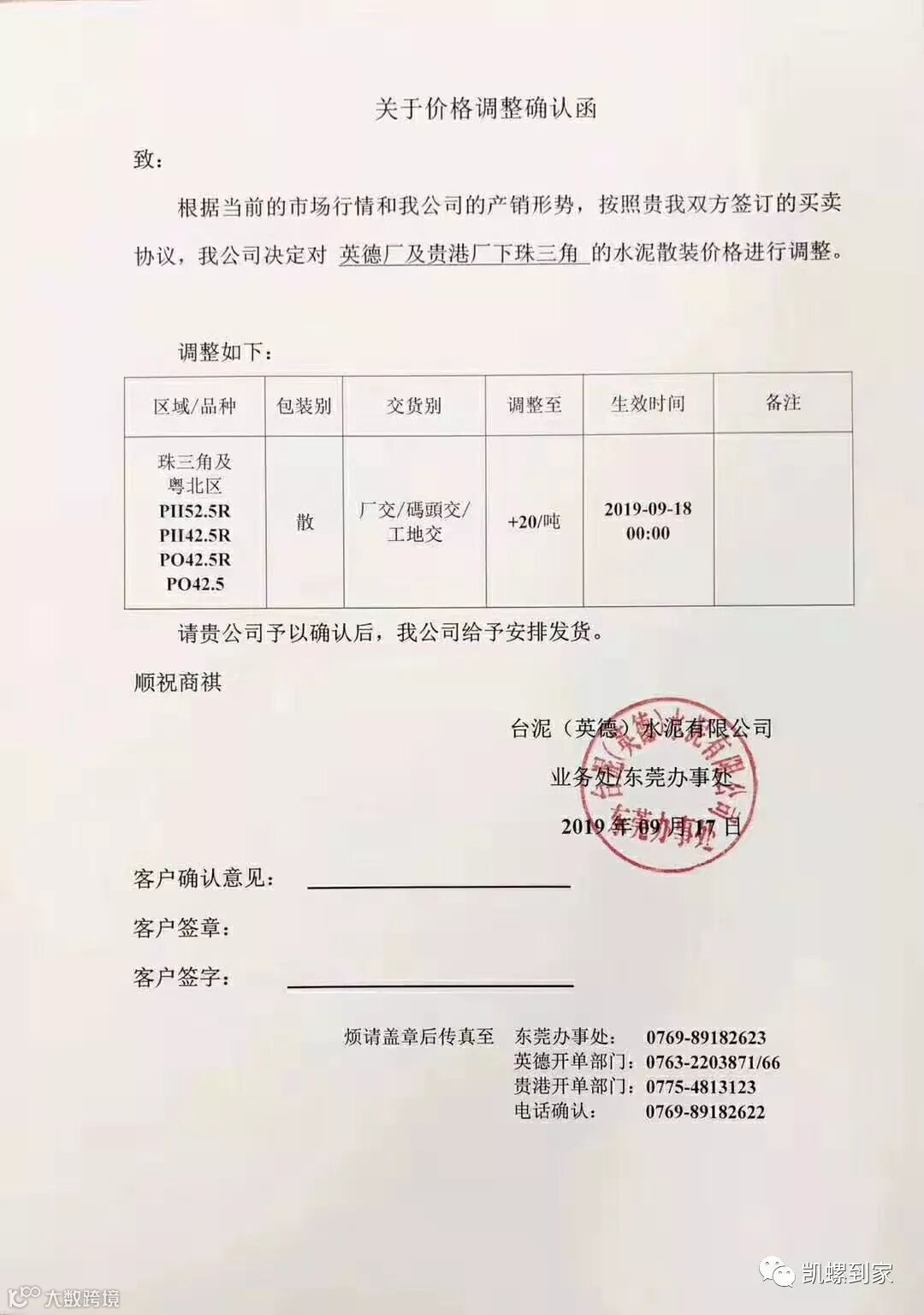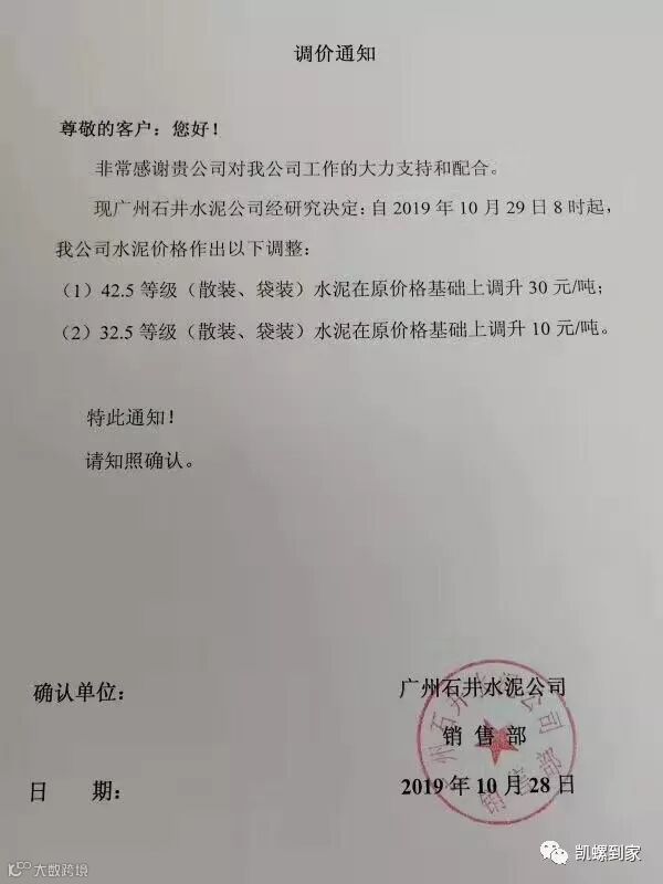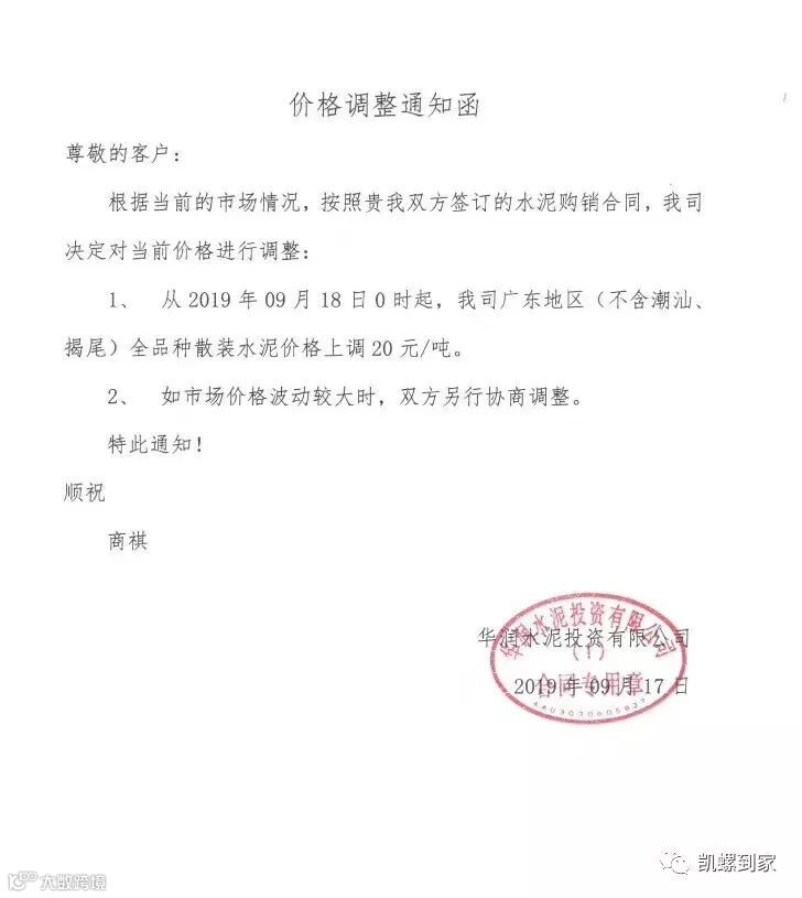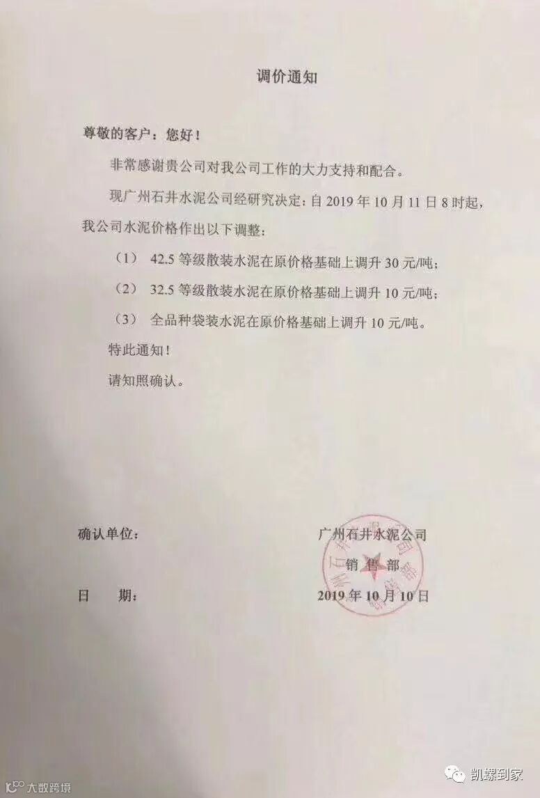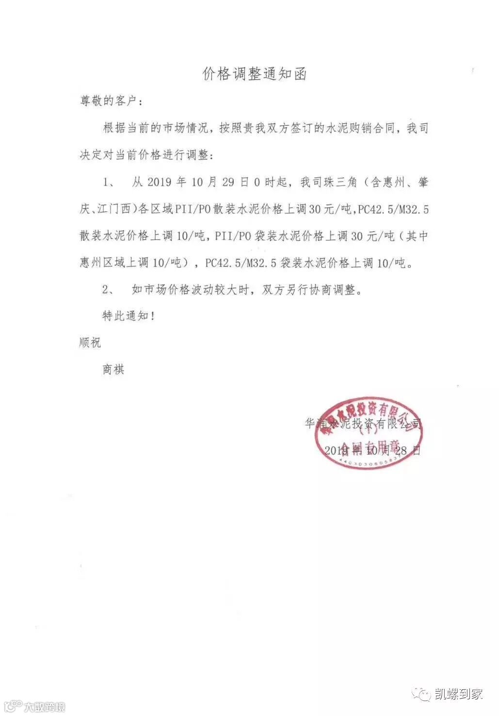 “凯螺到家”作为珠三角地区各大品牌水泥一级代理商,从9月份起就陆续收到各大合作厂家的水泥价格上涨的调价函