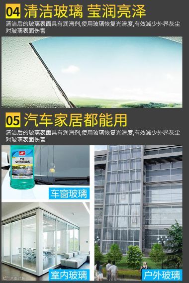 5.润滑性能:车窗中含有乙二醇,粘度较大,可以起润滑作用,减少雨刷器与玻璃之间的摩擦,防止产生划痕。