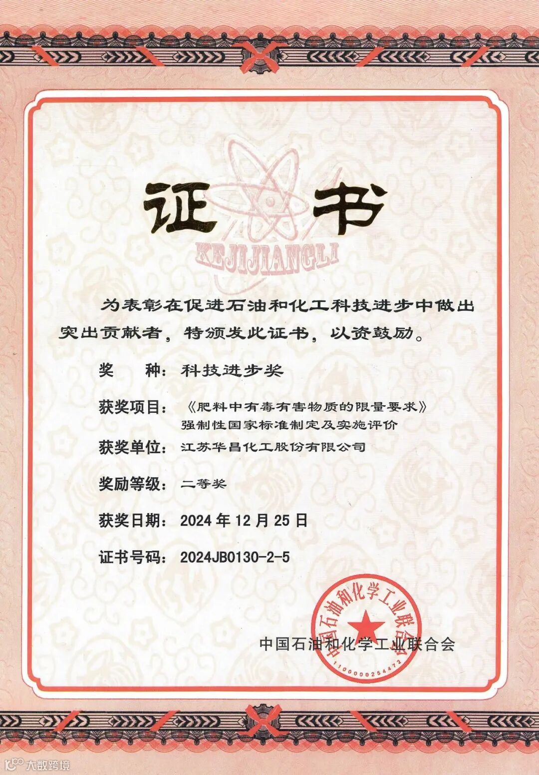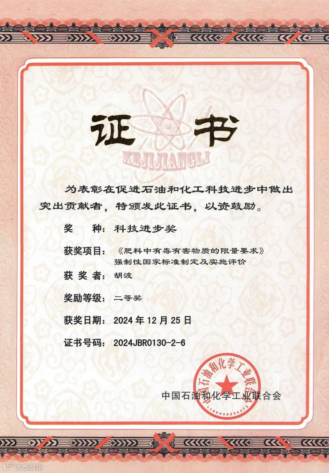2024年12月底,2024中国石油和化学工业联合会科技奖励大会在北京会议中心召开。江苏华昌化工股份有限公司董事长胡波参与申报的《肥料中有毒有害物质的限量要求》强制性国家标准(以下简称《标准》)制定及实施评价项目喜获科技进步二等奖。