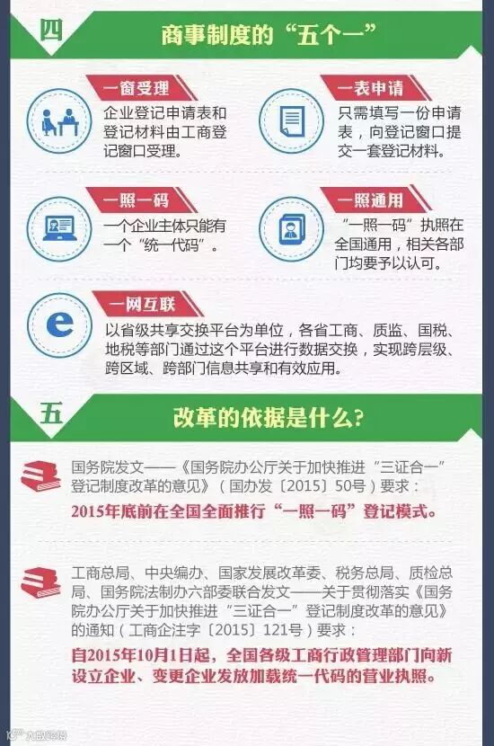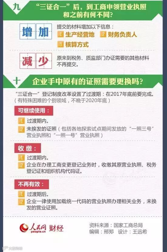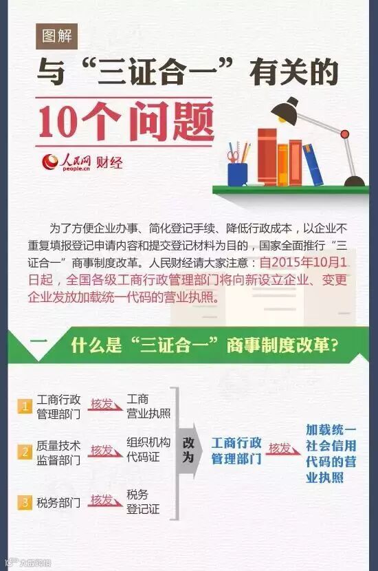 10月1日以后,营业执照、组织机构代码证和税务登记证“三证合一”,新设立的企业、农民专业合作社,只要向工商部门提出申请,获得一个加载统一社会信用代码的营业执照(即“一照一码”),就算注册成功。
