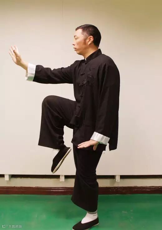 “金鸡独立”为太极拳之招式,示范者为太极功法老师程天骥。