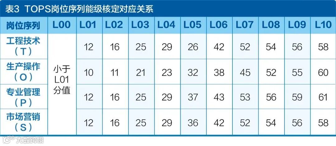 除综合管理(M)岗位序列员工的能级设置由党委组织部门按照相应的管理办法评定外(下同),TOPS岗位序列员工能级核定对应关系如下页表3所示。