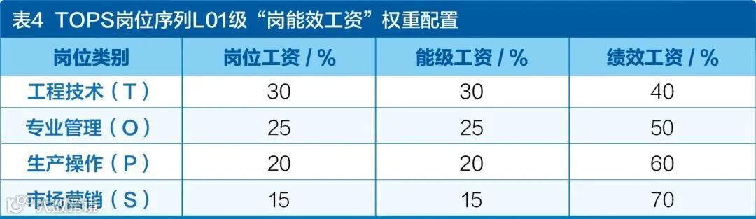 根据各岗位序列的工作特征、价值创造规律和绩效考核方式,分类配置岗位工资、能级工资、绩效工资的权重,提高差别化的绩效激励和能级激励强度。在薪酬总额不变的情况下,随着员工能级提升,其岗位工资占比逐渐降低,能级工资与绩效工资占比逐渐提高。表4以TOPS四类岗位序列L01能级为示例,说明“岗能效工资”权重配置。