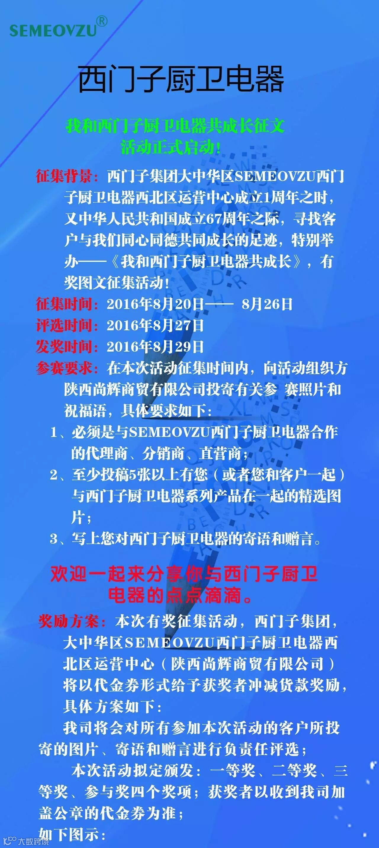 征集背景:暨西门子集团大中华区SEMEOVZU西门子厨卫电器西北区运营中心成立1周年之时,又中华人民共和国成立67周年之际,寻找客户与我们同心同德共同成长的足迹,特别举办——《我和西门子厨卫电器共成长》,有奖图文征集活动!