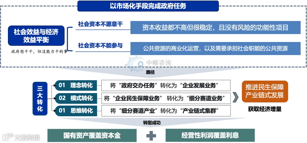 政府与市场融合的发展模式是一种创新且有效的方式。面对社会资本不愿或不能参与的项目,如资本收益稳定但不高的功能性项目和公共资源商业化运营等,国有企业通过将政府交办任务转化为企业发展业务、把企业民生保障业务转化为细分赛道业务、将细分赛道产业转化为产业链式集群这三大转化路径,推进民生保障产业链式发展,获取经济增量。从而实现国有资产覆盖资本金、经营性利润覆盖利息,达到企业社会效益与经济效益的平衡。