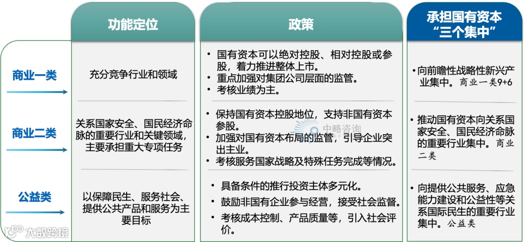 国有资本的投资方向主要向三个领域集中:第一个是向关系国家安全、国民经济命脉的重要行业集中,从功能定位上主要对应的就是商业二类国企;第二个是向提供公共服务、应急能力建设和公益性等关系国计民生的重要行业集中,从功能定位上主要对应的是公益类国企;而商业一类国企定位为充分竞争行业和领域,也就是国有资本只能向前瞻性和战略性新兴产业集中,即国资委强调的“9+6战新产业”。