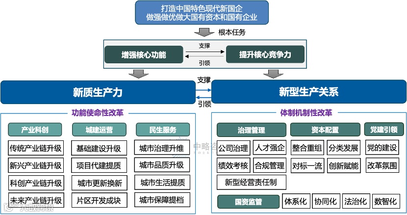 可以预见,“十五五”期间,国有企业的任务功能会发生巨大的转变,由原来以基建任务为主,逐渐转变为解决新时代下经济新形势的高质量发展,比如,科创、卡脖子、社会服务等。以增强核心功能和提升核心竞争力为根本任务,建立与新质生产力相适应生产关系,推进功能使命和体制机制改革。