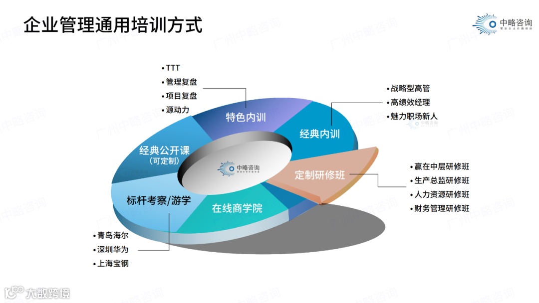 中略咨询顾问通过辅导企业建立和完善企业“培训组织体系、培训资源配置、培训管理、规范流程、考核评价、内训师队伍建设和培训管理机制”,明确各部门对培训的职责以及“监督培训,评估和反馈培训效果”,使公司的培训投入产出效能更高,使培训真正达到提高员工工作技能、绩效以及公司整体绩效的目的。主要咨询服务内容如下: