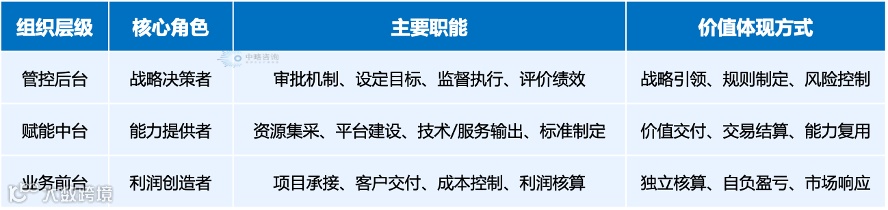 在组织体系设置中,明确“管控后台(公司领导班子)、赋能中台(综合管理部)”的角色定位与职能规划,切实落实“业务前端”所要求的“经营授权、管理赋能和价值创造服务保障”。