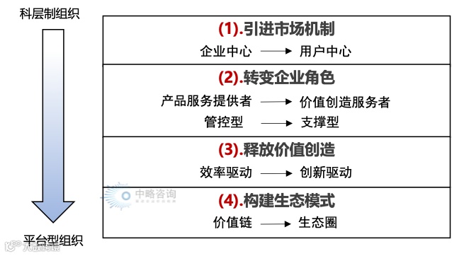 将科层制组织(直线职能制)打造成平台型组织,则,需要:(1)引进市场化机制(转观念,从企业中心,转到用户中心);(2)转变企业角色(从管控型转向支撑型,从关注产品服务转向价值创造服务);(3)释放价值创造(创新内驱机制);(4)构建生态模式(沿价值链打造组织价值创造生态圈)。