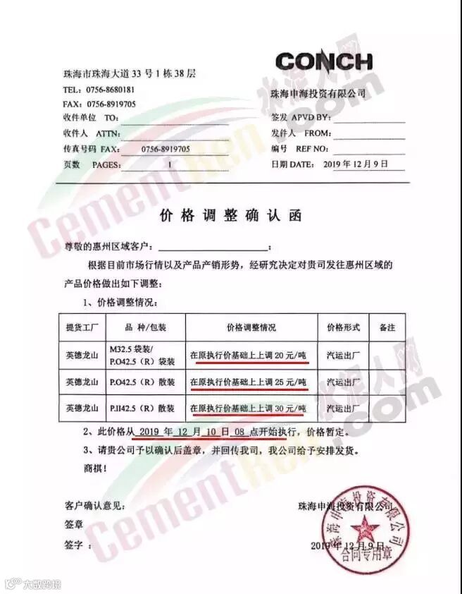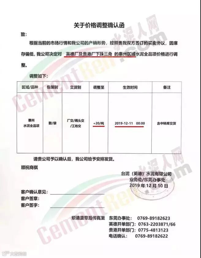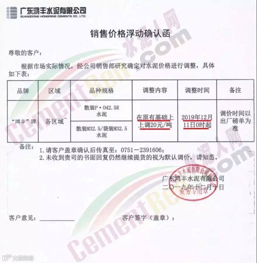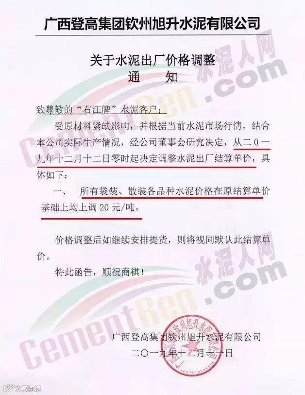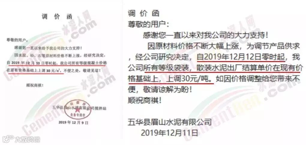 12月11日五华县眉山水泥有限公司发调价函称,因原材料价格不断大幅上涨,为调节产品供求,经公司研究决定,自2019年12月12日零时起,公司所有等级袋装,散装水泥出厂结算单价在现有价格基础上,上调30元/吨。