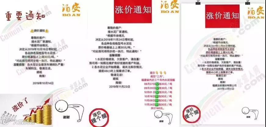 年底了,很多工地都在忙着赶工期,需求量大,而年底正处于“停产?停运?没货?”的状态,很多水泥经销商已经表示撑不住了。除此之外,叠加北方各地区冬季水泥行业错峰生产,水泥的库存量持续紧张,现在对于水泥经销商来说,涨价已经成为习惯了。最高价,最高涨幅,最霸气的涨价通知还在继续...