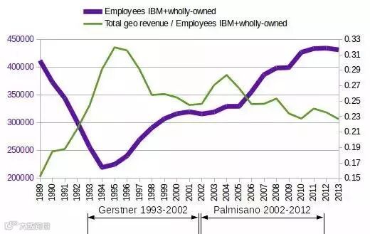 备注:1993年郭士纳接手IBM时,IBM亏损高达160亿美元,经过一系列大刀阔斧的变革,付出了80亿美元的行政改革费用。2001年,IBM总营收达到884亿美元、净赢利77亿美元。