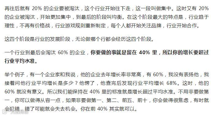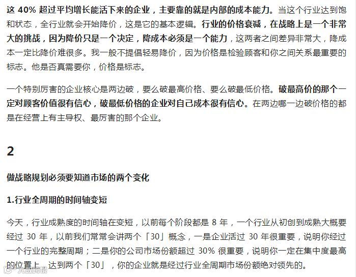 我帮很多公司做战略,以前我们做战略的时间轴可以做五年,现在最长只能做三年,最合适的是两年,因为现在行业全周期时间只有十年。如果你在那种替代性技术特别高的行业里全周期连十年都没有,只有五年。比如手机,五年大概一个行业周期就过去了。为什么手机行业的新兴企业替代速度如此之快,几年就会出现一个很厉害的手机企业,原因就在这。
