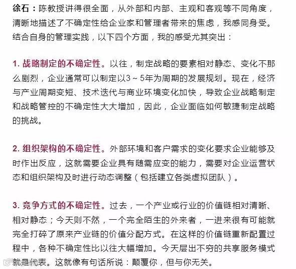 徐石:确实,应对不确定性需要立体思维和多维策略。首先心态非常重要,用积极开放的心态去拥抱不确定性是唯一的选择。当然,还必须通过变革机制和组织方式加以配合,而IT系统则是实现变革的有效保障和支撑。这主要体现在几个层面:一是构建数据驱动企业,让企业的生产运营、市场营销及管理过程实现数据化,从而使企业构架在数据之上,让决策更全面和精准。二是实现实时企业管理。企业与客户和供应商实时互动,让前后端一体化,业务与运营一体化,是构建敏捷组织的基础。三是企业智能化运营,借助云、大数据分析以及AI技术让企业智能化,是实现企业升级的一大命题。数据驱动、实时企业和智能化这三者最终都将归集到协同管理的理论和实践上来。