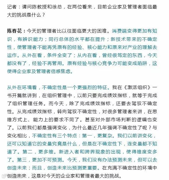 陈春花:对于未来,技术带来非常多的好处。第一,它使得人与人之间在管理上的沟通,变得更加高效。第二,更大系统范围内的协同效应会变得更容易。第三,由于有了管理技术特别是数字化的管理能力,人会变得更加自由,更容易发挥创造力,更有价值。所以我才会问徐总:你提供的管理软件,是不是让员工更幸福?我认为人会变得更幸福,因为你的空间更大,自由度更大,就会更幸福。企业会比传统的科层结构更加灵活,更加有活力,变成幸福组织。