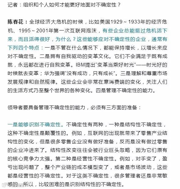 陈春花:我研究的主线就是企业的可持续性。过去20多年,我集中研究了海尔、联想、华为、TCL和宝钢,这5家企业涉及不同所有制,既有上市公司,也有非上市公司;既有to C(面向终端用户)的,也有to B(面向企业级客户)的,基本上各种类型都照顾到了。