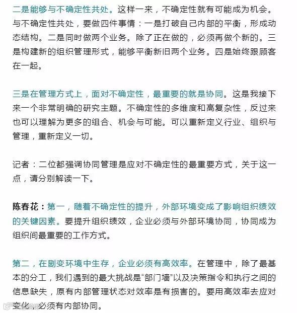 过去一百年的组织管理,都没有遇到我们今天面临的挑战:组织外部环境已成为影响组织绩效的关键因素。我在研究中发现,有三样东西变了:第一,效率不再来源于分工,而是来源于协同。这是第一个根本性的改变。第二,必须激励价值创造,不能只做绩效考核。原来我们在意的是绩效考核,但是今天由于不确定性的存在,我们必须注重价值创造。就像很多新兴的互联网公司所强调的,要去中介化、去中心化,聚焦于价值创造环节。第三,文化上的改变。要塑造新文化。今天的文化要求有更多的包容性,要更加开放,要接受失败和错误,因为要与创新为伍。