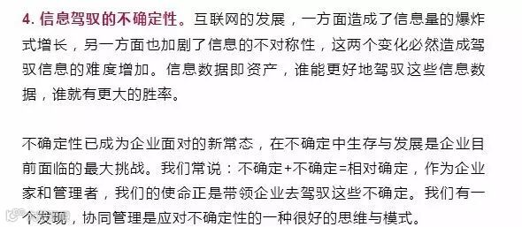 新的管理方式到底是什么?互联网状态下,组织到底应该是什么?怎样让管理跟组织绩效、组织发展相匹配?仅凭经典管理理论,很多问题是解决不了的。以前,绩效来自于组织本身;现在,绩效必须来自于组织外部。这就使得协同变得非常重要,所以我正式告诉自己,在组织管理的研究中,必须认真地把协同管理的内涵、逻辑和理论挖掘出来。如果能够挖掘出来,可能会形成一个基本理论,以解答面对不确定性和外部环境决定组织绩效的难题。