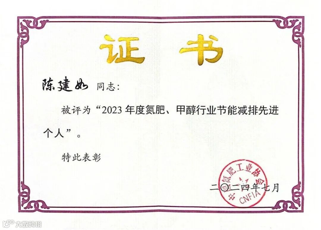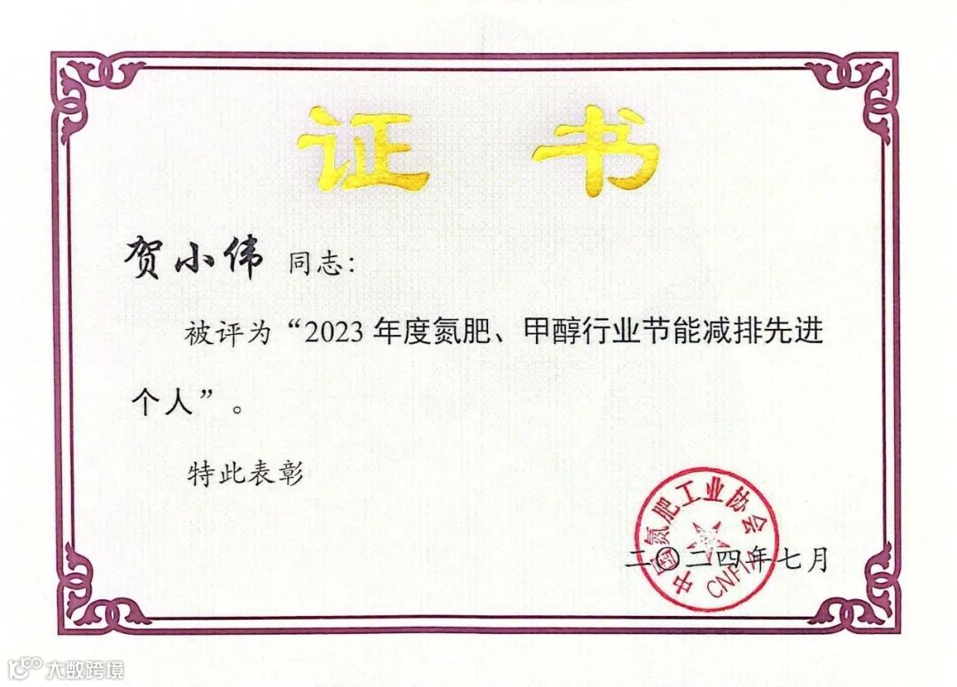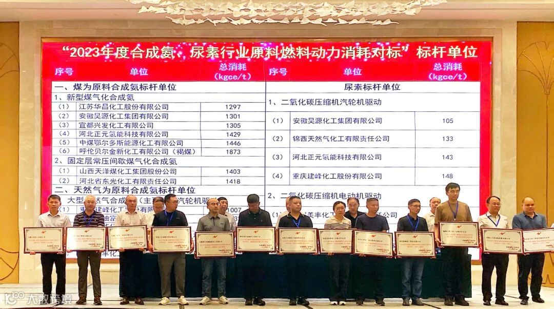 会上,中国氮肥工业协会对“2023年度合成氨、尿素行业原料燃料动力消耗行业对标“标杆单位进行颁奖授牌,并发布“2023年度氮肥、甲醇行业节能减排先进单位和先进个人”名单。华昌化工获评“2023年度氮肥、甲醇行业节能减排先进单位”,华昌化工党委书记、副总经理贺小伟,工艺总工程师陈建如获得“2023年度氮肥、甲醇行业节能减排先进个人”荣誉称号。
