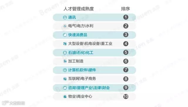 人才管理成熟度的综合排序中,通讯行业人才管理成熟度水平最高,与2014-2015年度调查结果中不同行业的排序结果相比 ,进步显著。互联网企业依然难逃后尾。