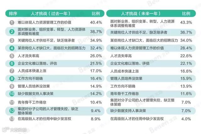 数据显示,企业在过去一年中面临的最大挑战是“难以体现人力资源管理工作的价值”,而在未来一年中则会面临“面对新业务,组织变革、转型,人力资源体系调整有难度”这一挑战。