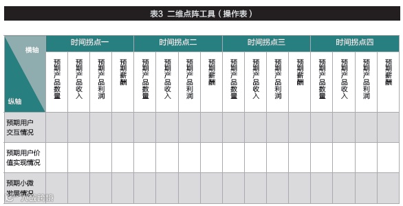 这个协调一致的体系在机制上取消了全世界大多数企业都在用的KPI考核,创新了纵横匹配的两维点阵表。横轴是产品价值,刻度分为高增长、高市场占有率和高盈利。重要的是纵轴,刻度依次是体验迭代的引爆、社群共创共享的生态圈和生态收入。