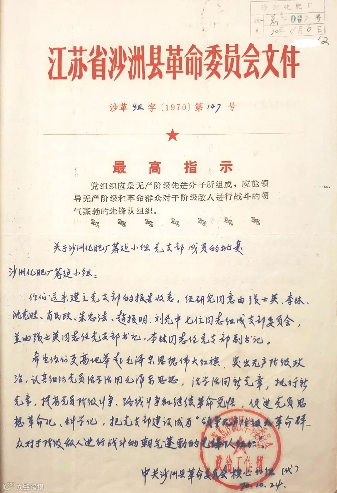 1970年10月24日,经沙洲县革命委员会以沙革字[1970]第147号文正式批准,沙洲化肥厂筹建小组党支部宣告成立。为筹建工作确立了坚强的政治核心与组织保障,更奠定了企业数十年来将党的建设与生产经营深度融合的独特传统与红色基因。