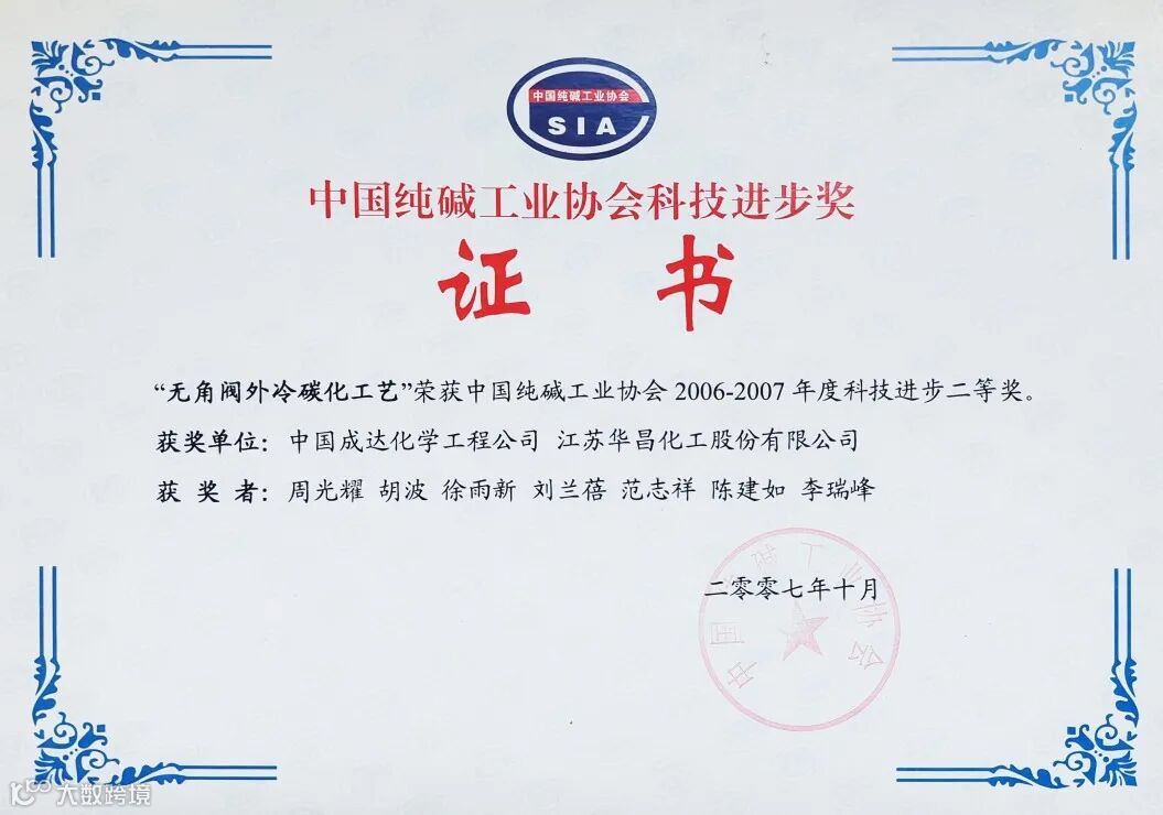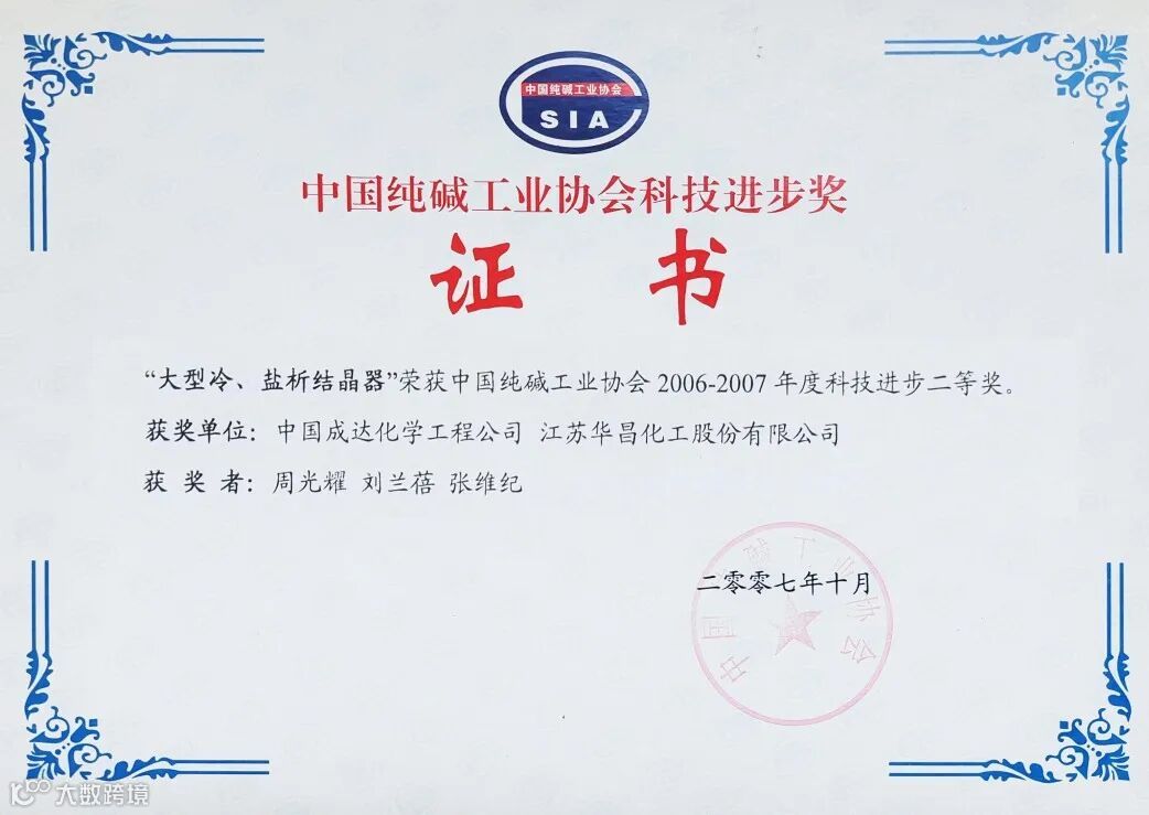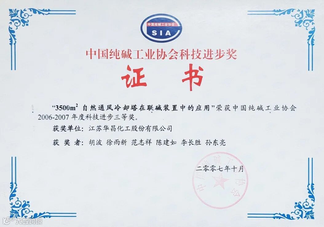 2007年10月,公司凭借“无角阀外冷碳化工艺”“大型冷、盐析结晶器”及“3500m²自然通风冷却塔在联碱装置中的应用”三项核心技术,荣获中国纯碱工业协会多项科技进步奖。这一技术集群的突破性成果,显著降低了生产能耗与水耗,为行业绿色工艺升级提供了示范性解决方案,标志着华昌化工在联碱技术领域已建立起显著的创新优势与行业影响力。